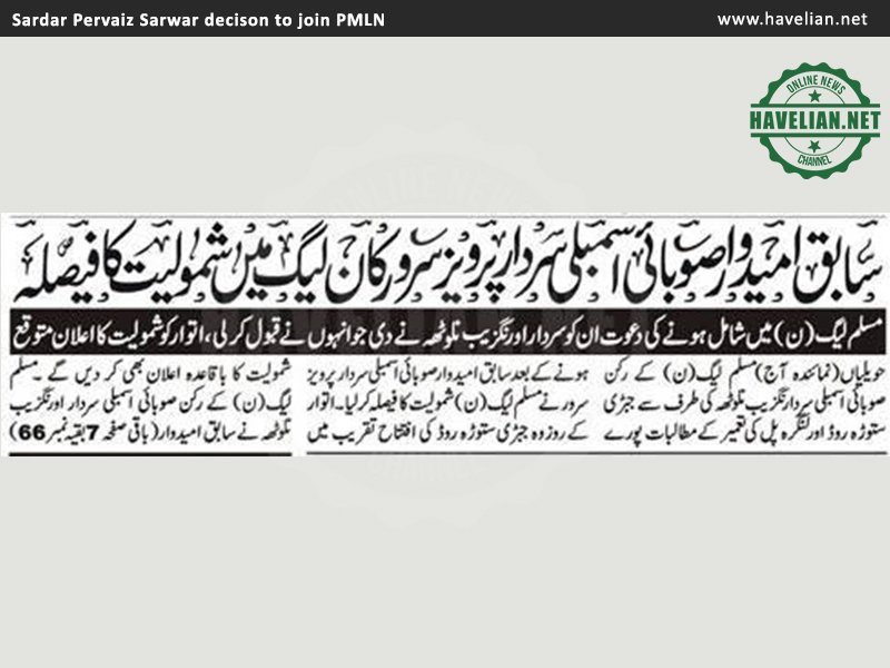 Former candidate for provincial assembly Sardar Pervaiz Sarwar has decided to Join PML(N)
