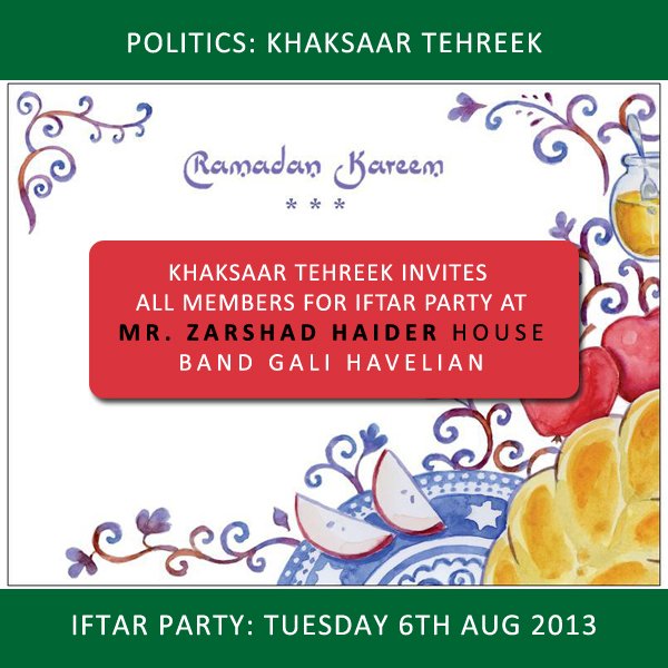 Posted by Havelian.Net | Page Views: 8458Khaksaar Tehreek invites all members for Iftar Party at Mr. Zarshad Haider's House Band Gali Havelian