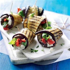 - 3. To serve, spread a heaped teaspoon of the feta and yogurt mixture onto each aubergine slice, adding a basil leaf and half a tomato. Roll the slices up, secure with cocktail sticks and serve as a starter or with lamb steaks for a main.