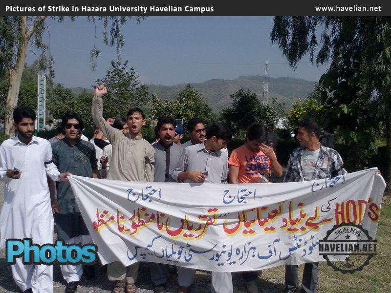 A large number of students participated in strike against recently illegal hiring and postings in Hazara University Havelian campus. University walls and notice boards was covered with "Go VC Go".