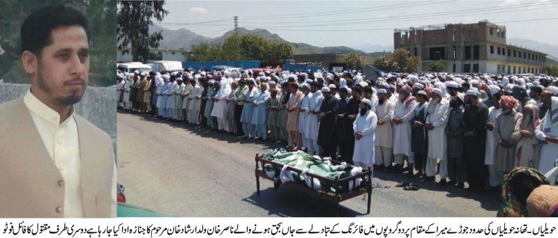 Posted by Altaf Hussain Shah | Page Views: 268292بچوں کی لڑائی میں بڑے کود پڑے ایک جاں بحق دو زخمی ملزمان موقع سے فرار مسجد صدیق اکبر جوڑے میرا لنگرہ حویلیاں میں نماز عصر کے وقت بچوں کے درمیان معمولی جھگڑا اور توں تکرار ہوئی جس کو ختم کرنے کے لیے نماز تراویح کے بعد جرگہ بیٹھا اور بات چیت چل رہی تھی کہ ملزمان نے آتشین اسلحہ کے ساتھ مسجد کے صحن میں اندھا دھند فائرنگ شروع کر دی جس کے نتیجے میں ناصر خان ولد ارشاد خان ساکنہ جوڑے میرا جاں بحق اور اشتیاق خان ولدفیاض الحسن اور حسن الیاس ولد الیاس خان فائرنگ سے شدید زخمی ہو گئے جنکو فوری طور پر حویلیاں ہسپتال پہنچایا گیا جہاں سے ایبٹ آباد ریفر کردیا گیا جس کی دعویداری الیاس خان ولد ارشاد خان نے نزیر ولد عبدالستار ساکنہ جوڑے میرا وسیم ولد ابراہیم،فیصل ولدابراہیم،نوید ولد نزیر،حسین ولد نزیر پر کروائی جس کی علت نمبر 566 جرم 302/324/34 کے تحت مقدمہ درج ملزمان کے خلاف کاروائی شروع کر دی اور ناصر خان ولد ارشاد خان کو دن گیارہ بجے سپردخاک کر دیا گیا